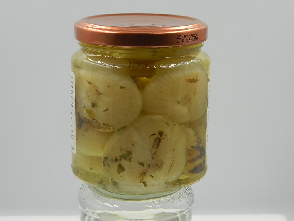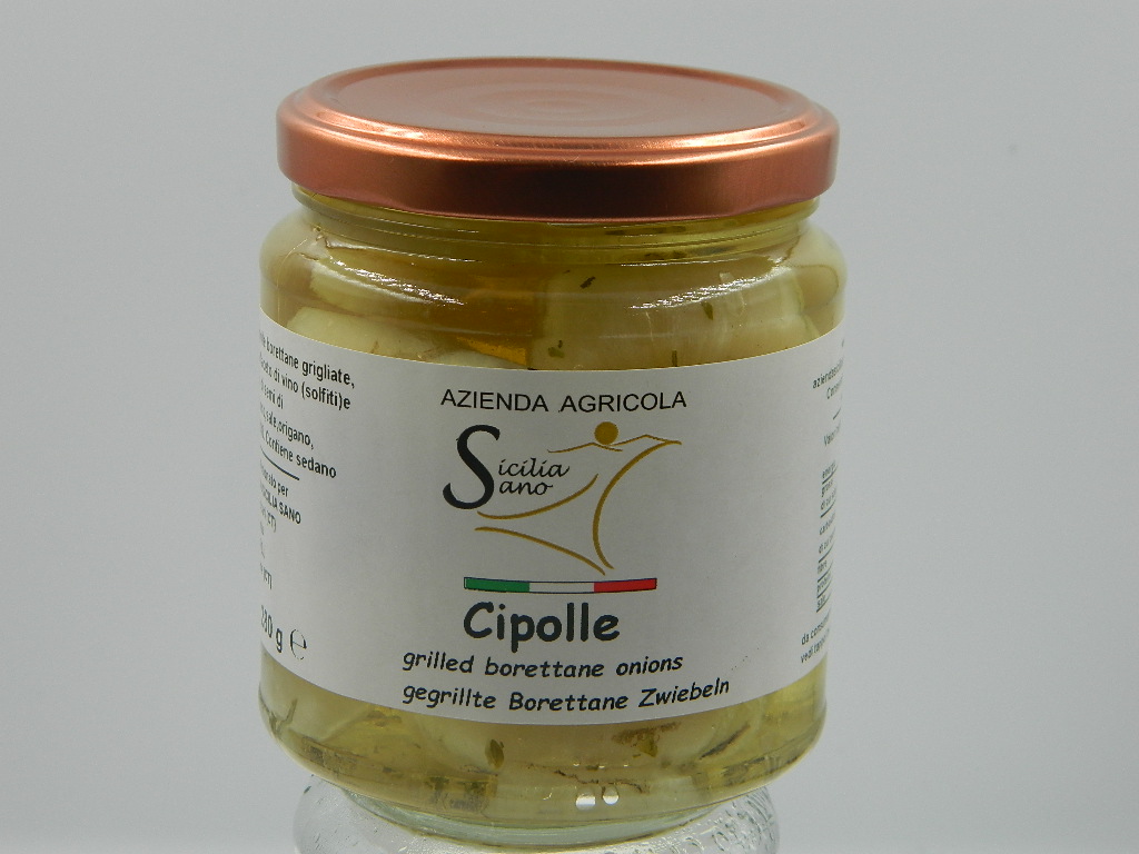 Ingredienti:Cipolle borettane grigliate, aromatizzati all'aceto di vino (solfiti)e balsamico,olio di semi di girasole,zucchero,sale,origano, prezzemolo,E330. Contiene sedano