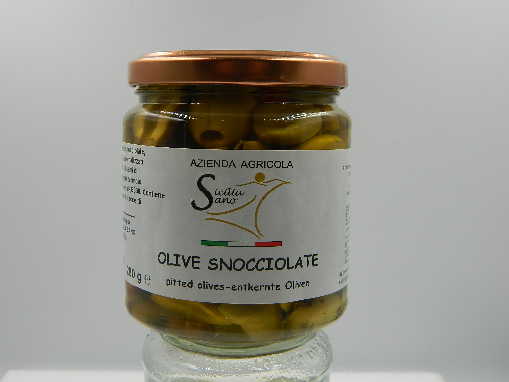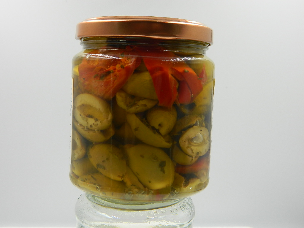 Ingredienti:olive verdi snocciolate, peperoni rossi dolci, aromatizzati